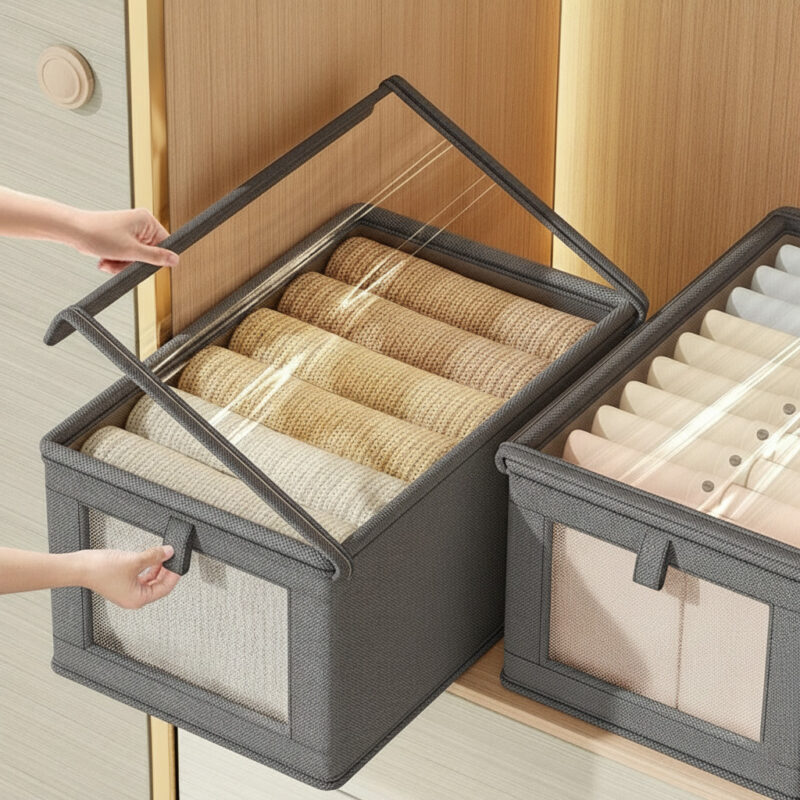 ¿Te pasa que no sabés dónde guardar la ropa de temporada o que perdés tiempo buscando cosas en cajas cerradas? Esta caja organizadora resuelve ambos problemas de una vez. Su ventana transparente te permite ver el contenido sin abrir, mientras que su tapa protege todo del polvo y la humedad.