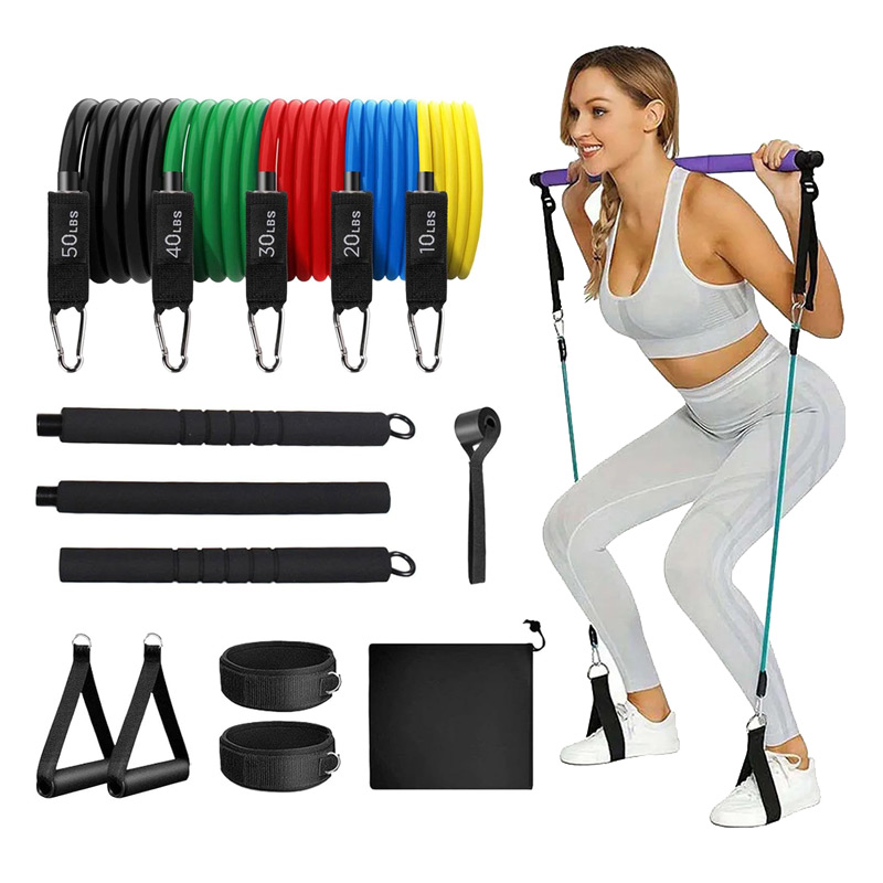 El set viene completo con todo lo necesario: barra desmontable en 3 piezas, 5 bandas de resistencia graduadas, manijas con ganchos, correas para tobillos ajustables, anclaje para puerta, y una bolsa de transporte para llevarlo a donde quieras. El sistema modular permite múltiples configuraciones de ejercicio.