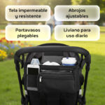 Incluye bolso organizador para cochecito (color negro) y correa con ganchos plásticos (color negro).