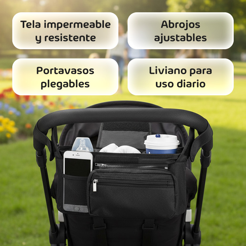 ¿Te pasa que salís con el cochecito y nunca tenés a mano lo que necesitás? Este organizador resuelve ese problema de una vez. Sus compartimientos mantienen todo bien ordenado y accesible: desde el celular y las llaves hasta mamaderas, snacks y juguetes pequeños.