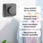 Su característica más destacada es el sistema retráctil que permite extender hasta 4,2 metros de soga cuando lo necesitás y recogerlo completamente cuando no está en uso. El mecanismo de ajuste por perilla te permite controlar la tensión perfecta para evitar que la ropa se curve o toque el suelo.