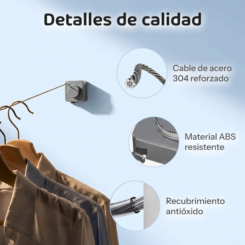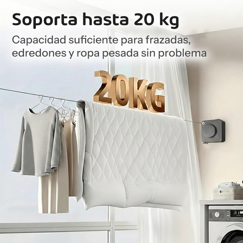 La soga de acero inoxidable 304 con recubrimiento nanométrico garantiza resistencia total a la corrosión y durabilidad extrema. Soporta hasta 20 kg de peso distribuido, siendo perfecta para colgar frazadas, toallas grandes, ropa pesada y múltiples prendas simultáneamente.