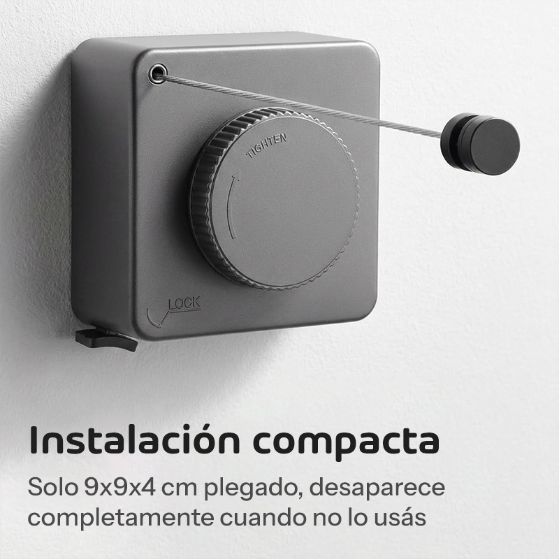 El sistema de bloqueo unidireccional es innovador: una vez que cerrás la perilla, la soga se mantiene tensa automáticamente y se retrae gradualmente conforme se va secando la ropa, manteniendo siempre la tensión óptima sin intervención manual.