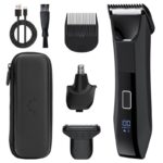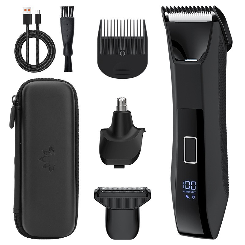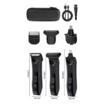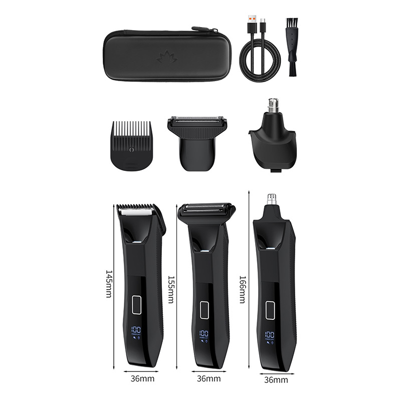Incluye: Afeitadora principal, 3 cabezales intercambiables (recorte, vello corporal, nasal), peine guía, cable USB, estuche de viaje EVA.