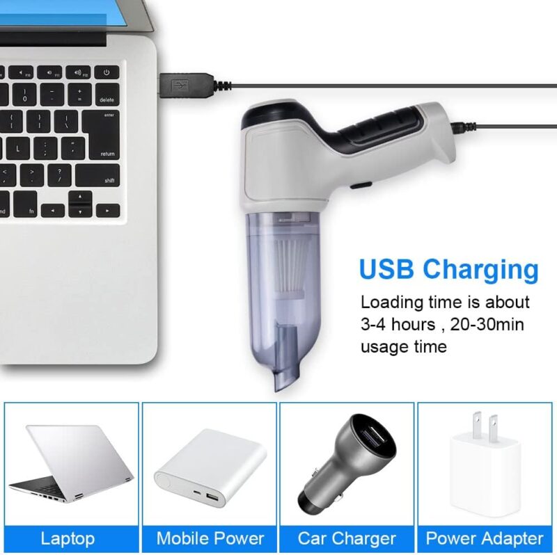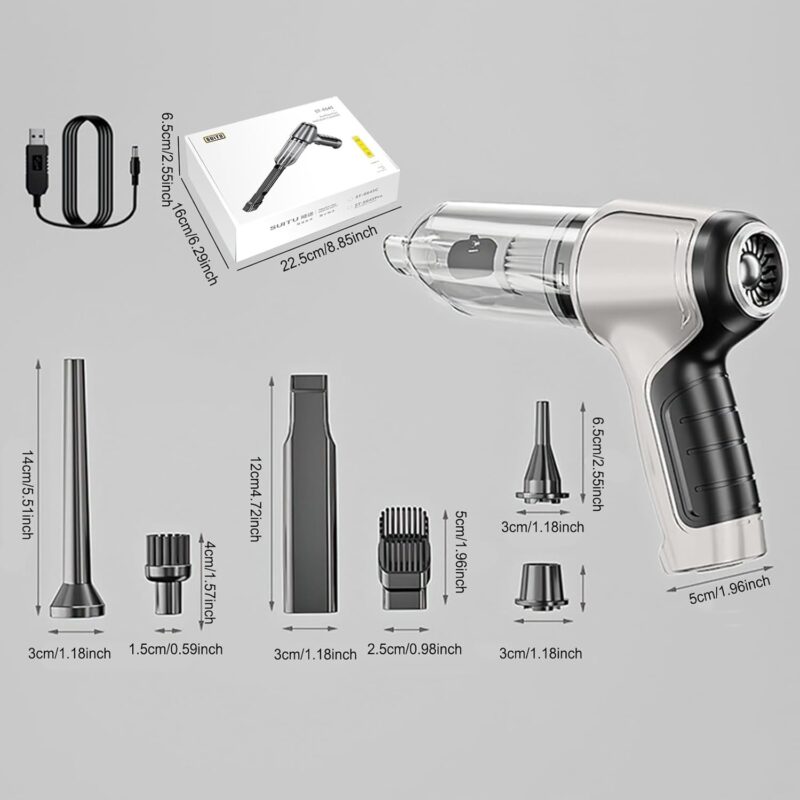 Incluye: Aspiradora portátil recargable con depósito transparente desmontable, boquilla plana alargada para succión, boquilla sopladora larga, boquilla de succión para rincones, boquilla sopladora corta, cable de carga USB, manual de usuario.