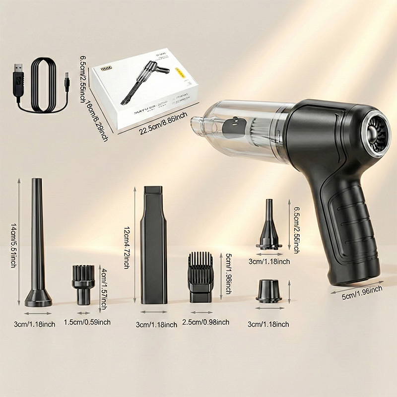 Incluye: Aspiradora portátil recargable con depósito transparente desmontable, boquilla plana alargada para succión, boquilla sopladora larga, boquilla de succión para rincones, boquilla sopladora corta, cable de carga USB, manual de usuario.