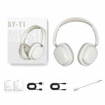 Incluye auriculares SY-T1, cable de carga USB-C, cable auxiliar de 3,5 mm, micrófono desplegable integrado, manual de instrucciones.
