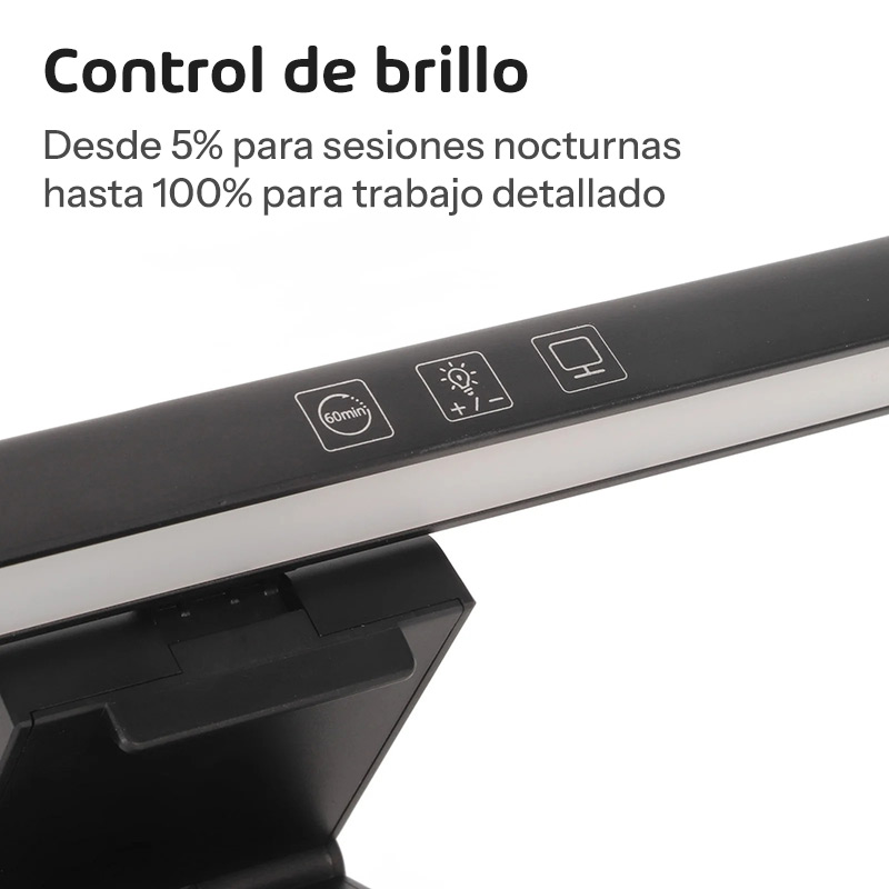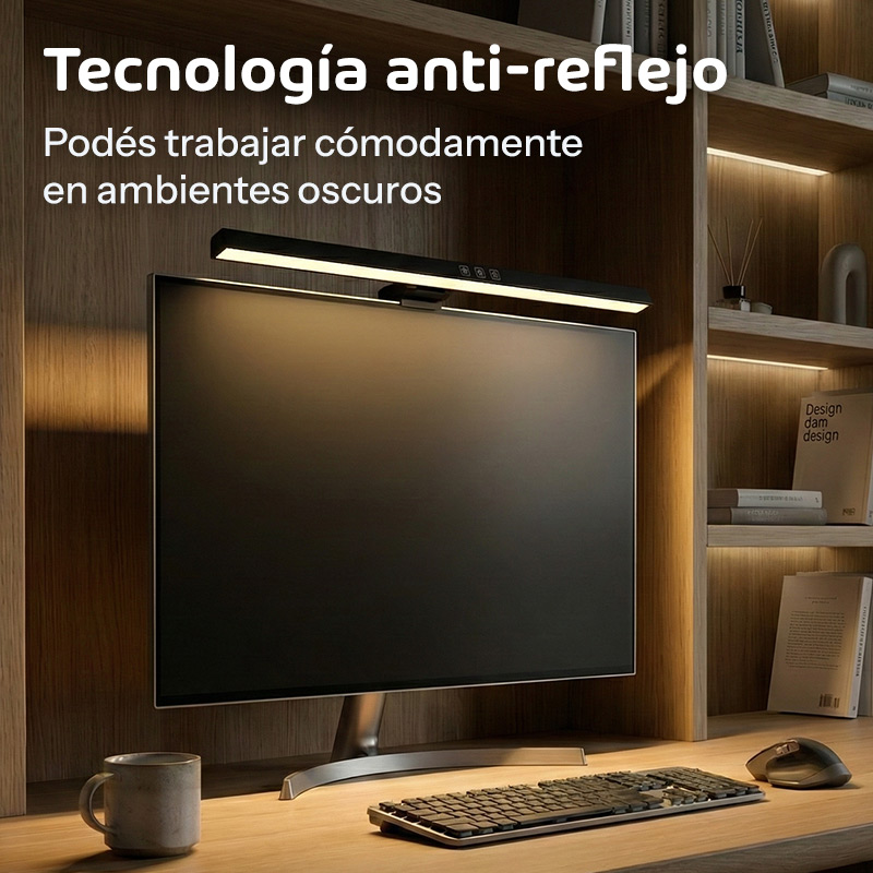 Tecnología anti-reflejo que marca la diferencia. Mientras otras lámparas crean molestos brillos en la pantalla, esta tiene un diseño óptico especial que dirige la luz hacia abajo y adelante, manteniendo tu monitor libre de reflejos. Podés trabajar cómodamente incluso en ambientes oscuros.