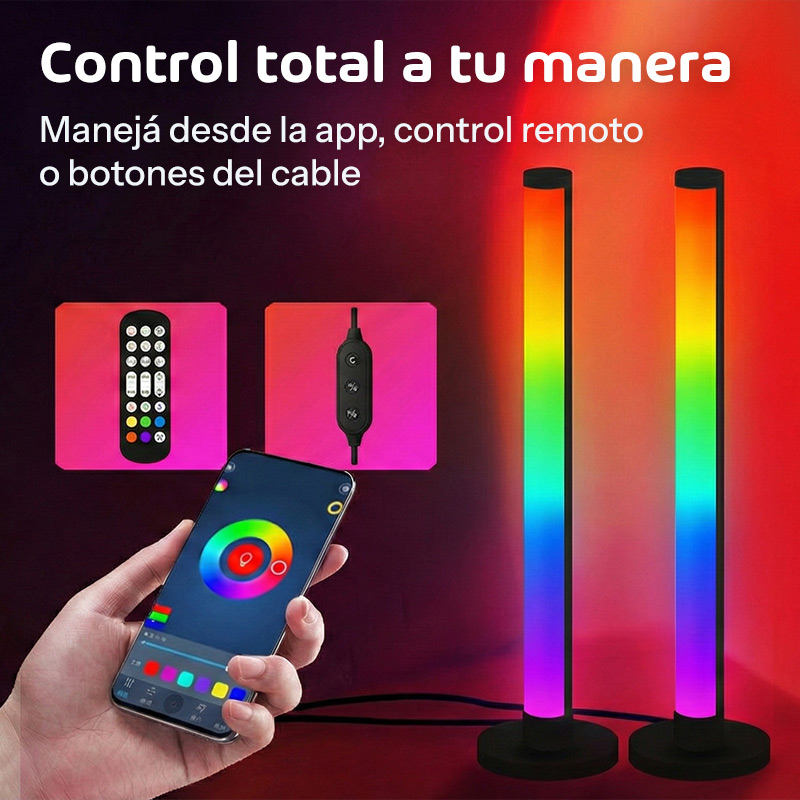 Set completo listo para usar: dos lámparas idénticas para crear simetría perfecta en tu setup, control remoto, cables de 2 metros para ubicarlas donde quieras, y la app gratuita con todas las funciones avanzadas.