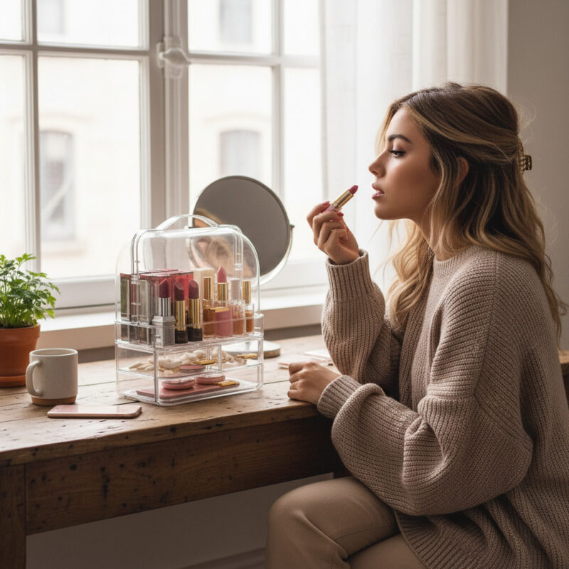 ¿Te cansaste de buscar el labial perfecto entre un montón de productos desordenados? Este organizador resuelve ese problema de una vez por todas. Su diseño completamente transparente te permite ver toda tu colección al instante, mientras que la tapa con cierre mantiene todo libre de polvo y humedad.