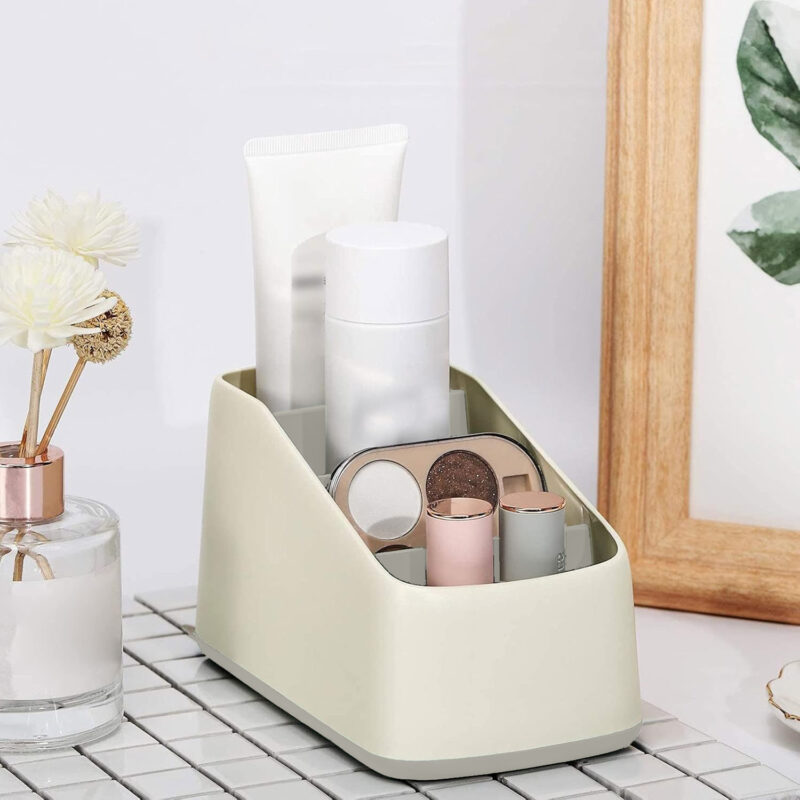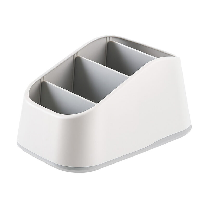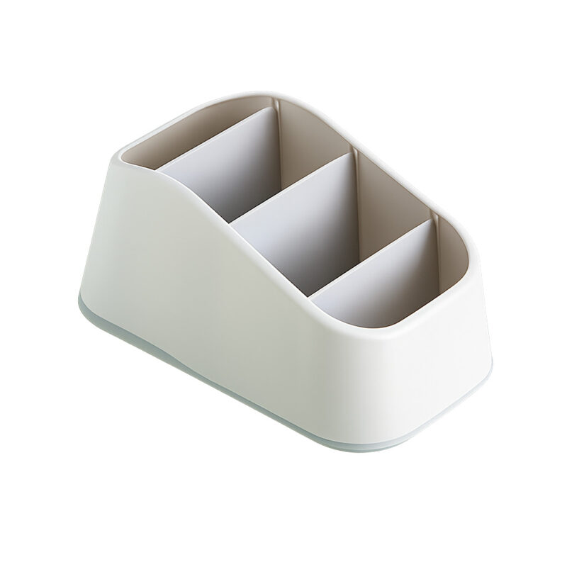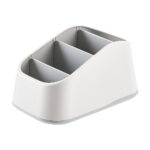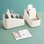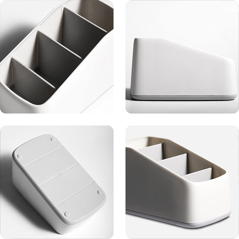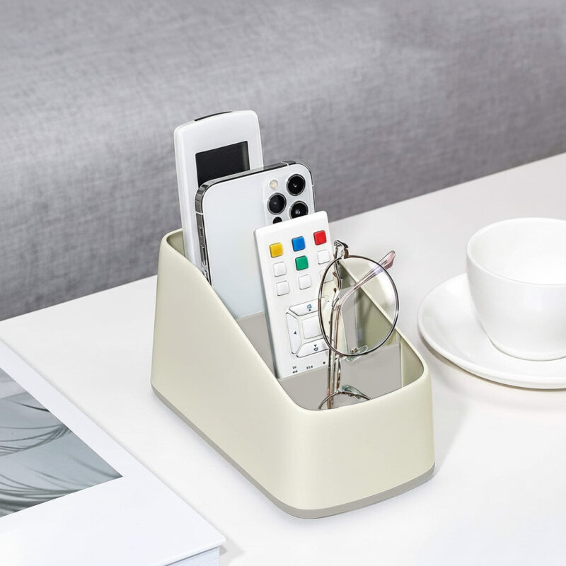 Su diseño inteligente con compartimentos de alturas variables te permite organizar desde lapiceras y marcadores hasta controles remotos, auriculares, cables USB y artículos de cosmética. El acabado bicolor con interior gris y base en contraste le da un toque moderno que combina con cualquier decoración.