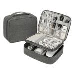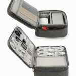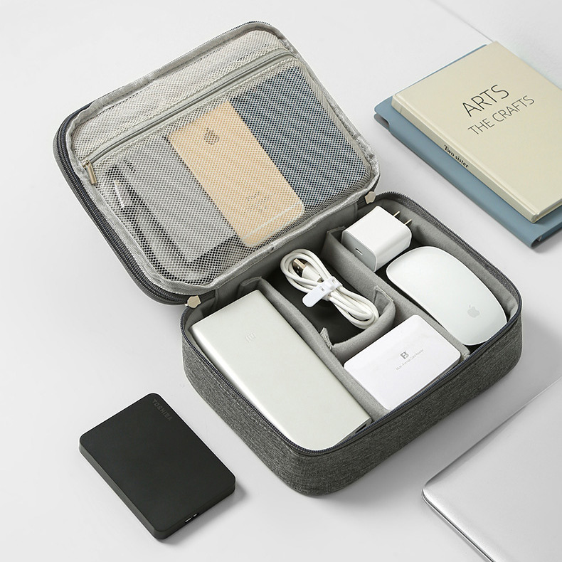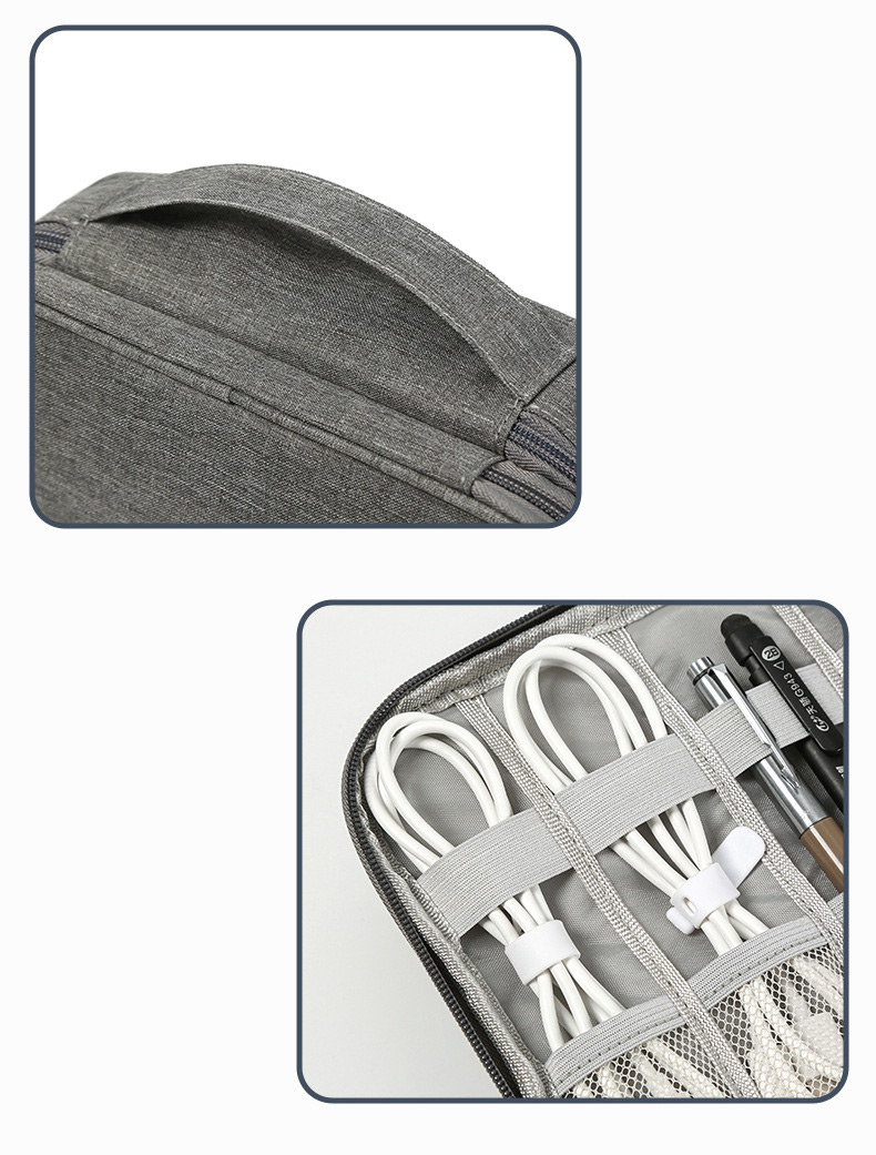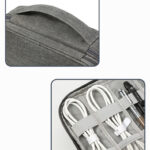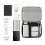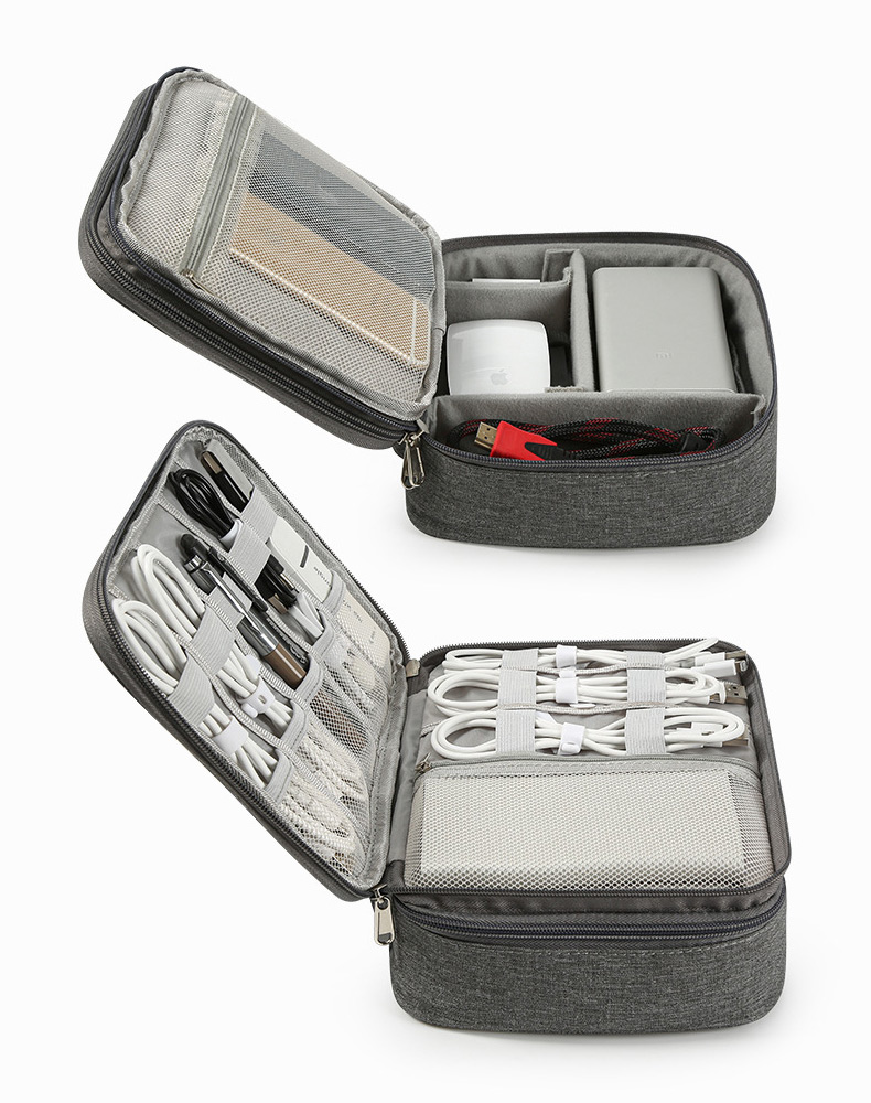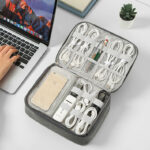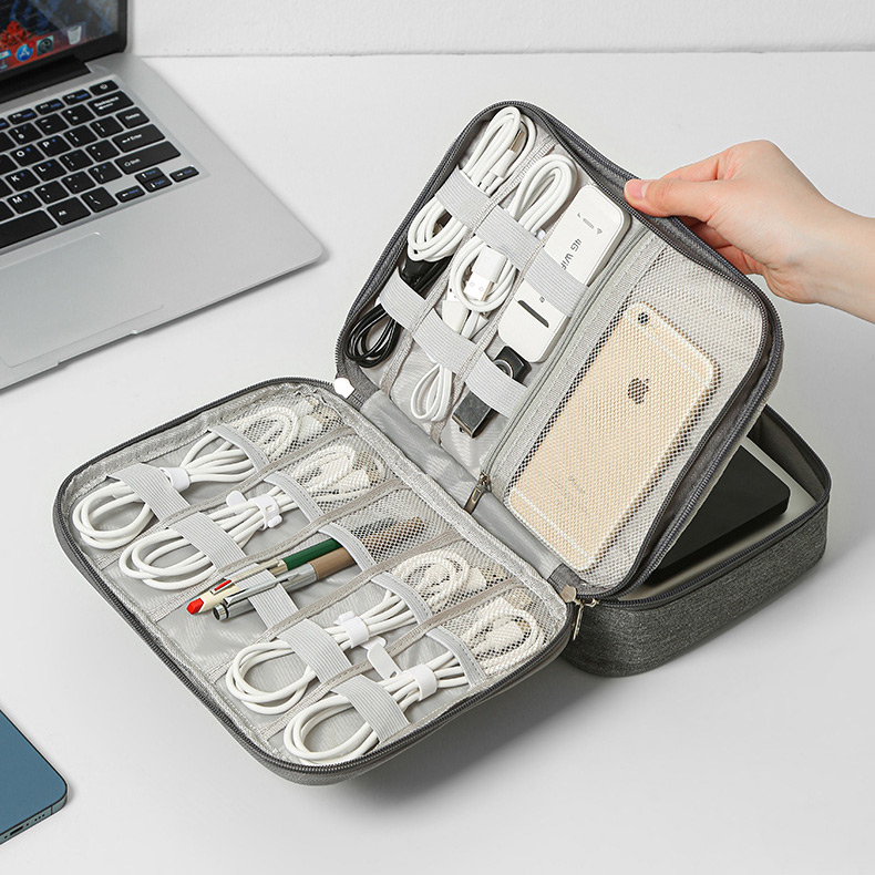 Lo que más destaca de este organizador es su diseño de doble nivel muy inteligente. El compartimento superior tiene elásticos y divisores que mantienen cables, auriculares, pendrives y adaptadores perfectamente separados y sin enredos. El nivel inferior es ideal para dispositivos más grandes como powerbanks, mouse, cargadores o hasta una tablet pequeña.
