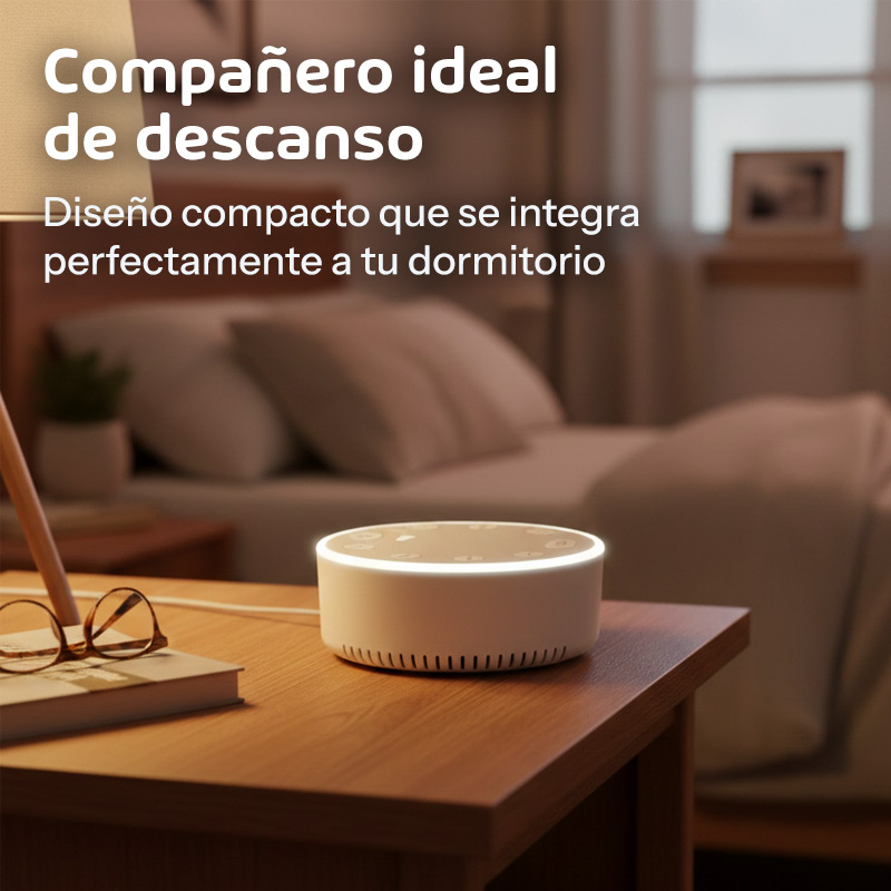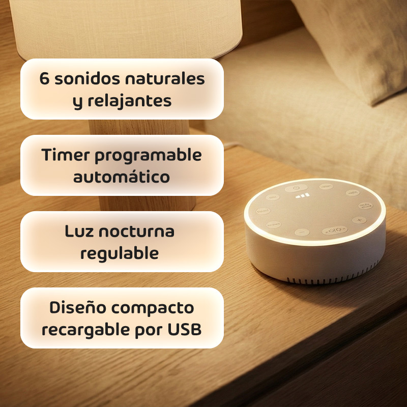 ¿Te cuesta dormir por los ruidos del tránsito o los vecinos? Esta práctica máquina crea un ambiente perfecto para el descanso. Podés elegir entre sonidos de lluvia, océano, bosque, relajación, calma y ruido blanco puro. Cada sonido está diseñado específicamente para bloquear las distracciones y calmar tu mente.