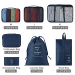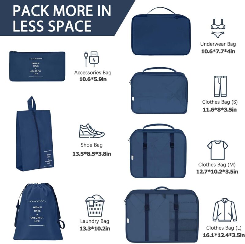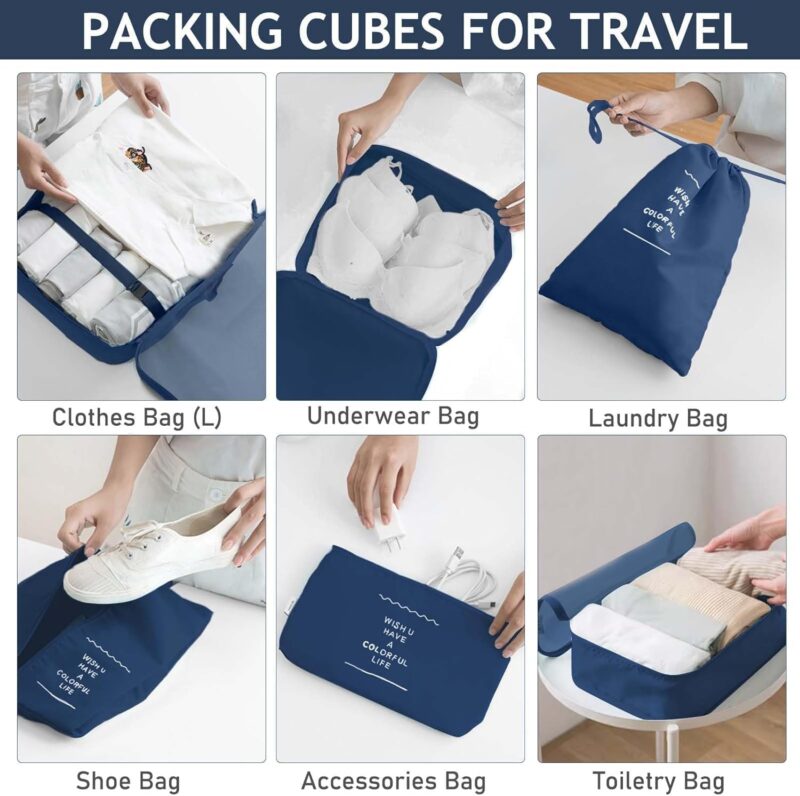 El set incluye tres organizadores para ropa (grande, mediano y chico), una bolsa especial para ropa interior, otra para calzado, un neceser plano para artículos de tocador y una bolsa con cordón para ropa sucia o cosas de último momento. Es como tener un placard portátil dentro de tu valija.