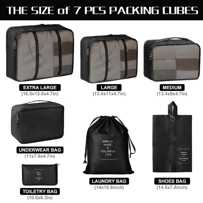 Cada organizador tiene el tamaño justo para maximizar el espacio de tu equipaje. Los organizadores de ropa tienen malla transparente en un lado para que veas qué hay adentro sin abrir, y material opaco del otro lado para privacidad. La bolsa de zapatos tiene compartimento separado para que no toquen la ropa limpia.