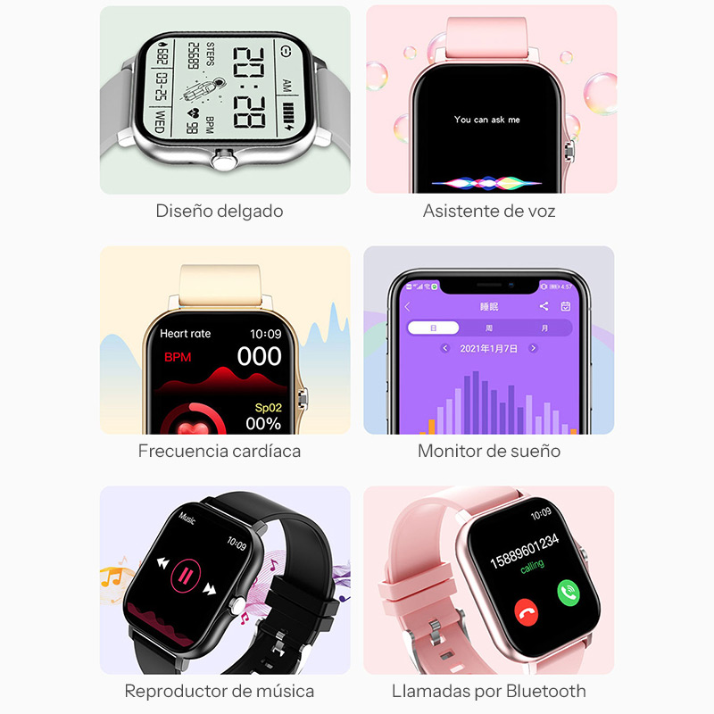 Los múltiples modos deportivos rastrean caminata, carrera, ciclismo y más actividades registrando tiempo, ritmo cardíaco y calorías. La función de llamadas Bluetooth con reducción de ruido te permite atender directamente desde el reloj. Las notificaciones inteligentes llegan instantáneamente a tu muñeca.