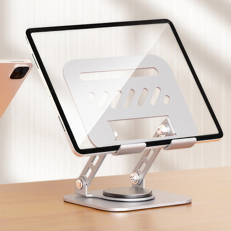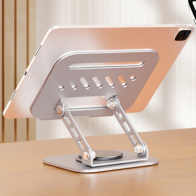 La rotación 360° con mecanismo de alta precisión te permite pasar de vertical a horizontal con solo un toque. El ajuste de altura es infinito – desde completamente plegado hasta 17 cm de altura – adaptándose perfectamente tanto para ver películas y series en el sillón como para videollamadas profesionales en el escritorio.